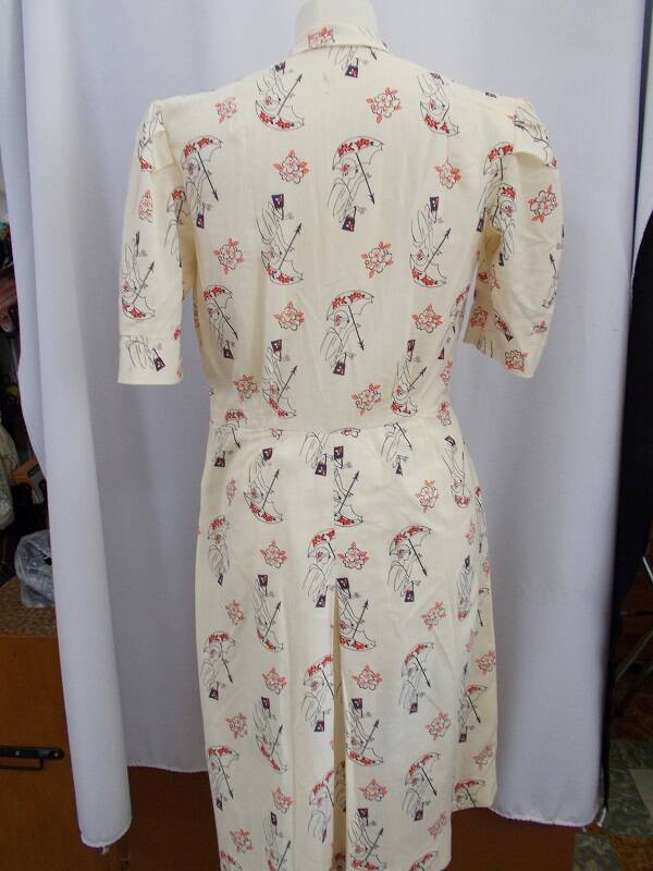Robe Vintage imprimée " Personnages" sur fond écru , fermée par 4 boutons et une petite pression finissant par un grand plis creux sur le devant