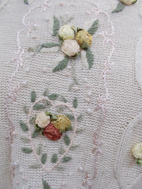 Devant torsadé et ajouré , agrémenté de fleurs et perles cousues ; bas fini par bordure picots